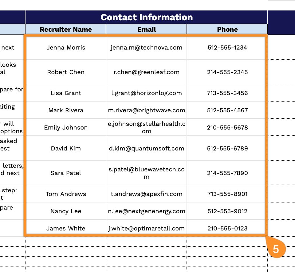 - Contact information database: Ready-to-use fields for recruiter names, email addresses, and phone numbers, ensuring you have all the networking details you need for professional follow-ups and relationship building.