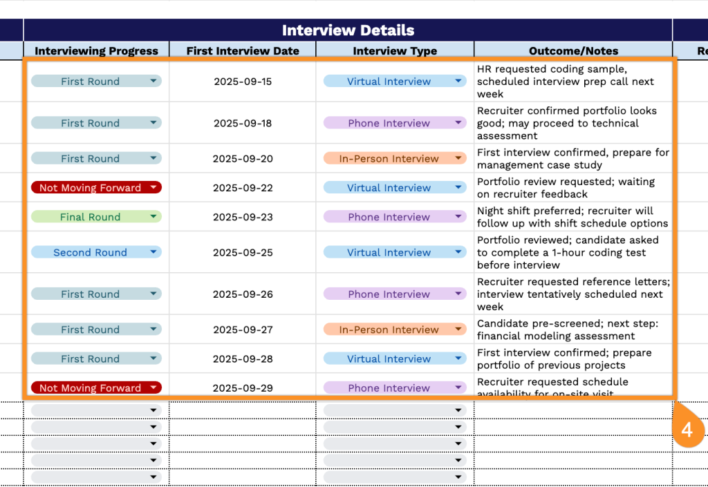 - Interview Type: Note the format of each interview (phone, virtual, in-person, skill test, etc.).