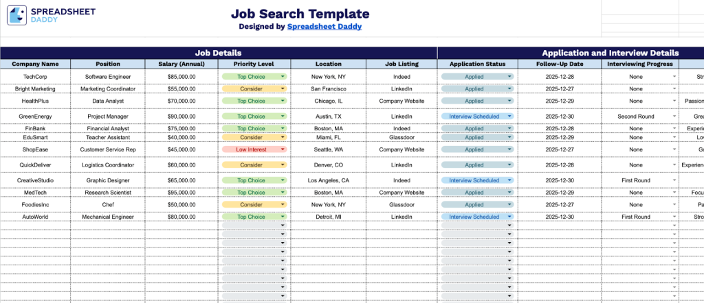 - Comprehensive job-tracking fields: The template includes organized columns for company name, position title, annual salary, priority level, and location, allowing you to capture all essential details for each opportunity and compare multiple positions side-by-side for informed decision-making.