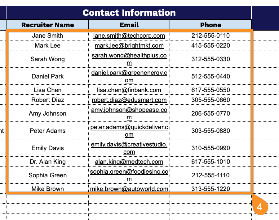- Complete contact information management: Store all recruiter and hiring manager details in designated fields for names, email addresses, and phone numbers, ensuring quick access to key contacts when you need to follow up or communicate about your application.