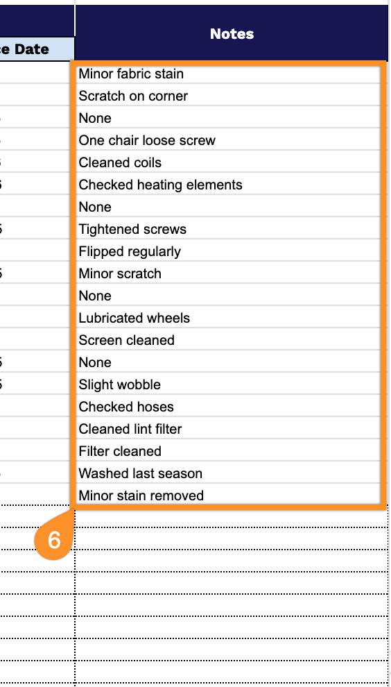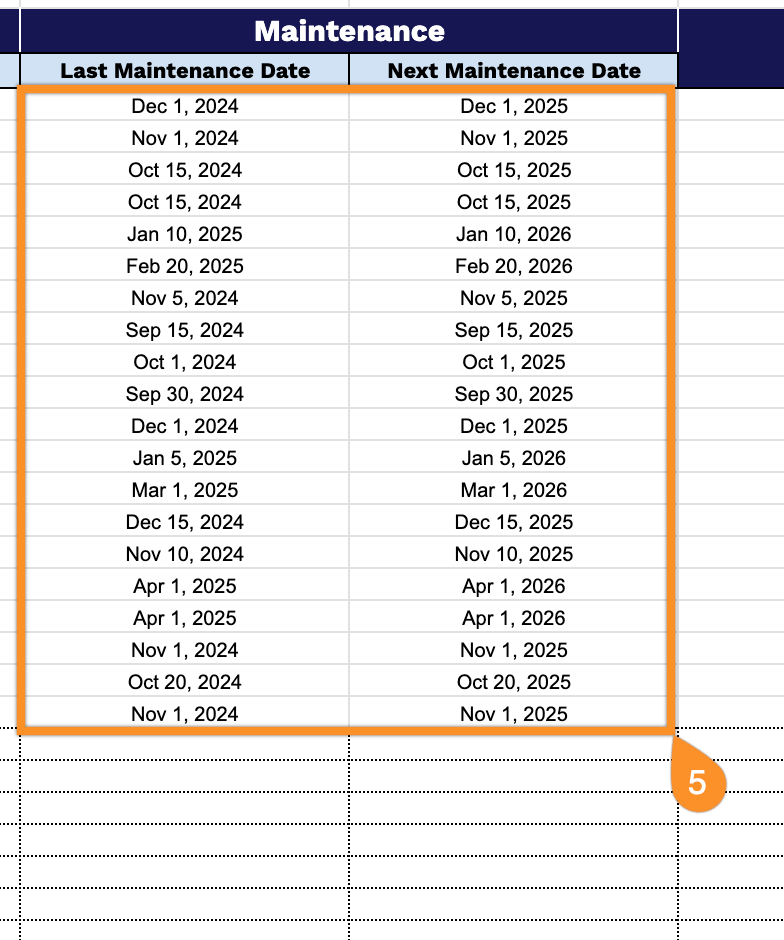• Maintenance scheduling: Plan and record property upkeep with fields for the last and following scheduled maintenance dates, as well as space for notes on repairs or service history.