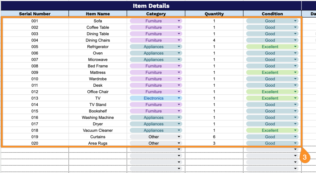 • Detailed item tracking: Record each item in the property with columns for serial number, category, quantity, and condition to maintain an accurate and organized inventory.