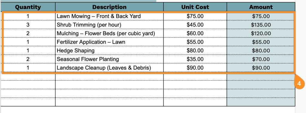 4. List each landscaping service you completed, whether it’s lawn mowing, mulching, tree trimming, or garden maintenance. For each service, enter the quantity provided, along with your rate. The template will automatically calculate the total for each line item.