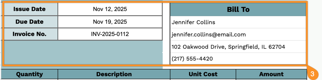 - Multi-row itemization table: A table with four structured columns (Quantity, Description, Unit Cost, Amount) enables you to list products, services, or items, providing a precise pricing breakdown for transparency and clarity in documenting each transaction line item.