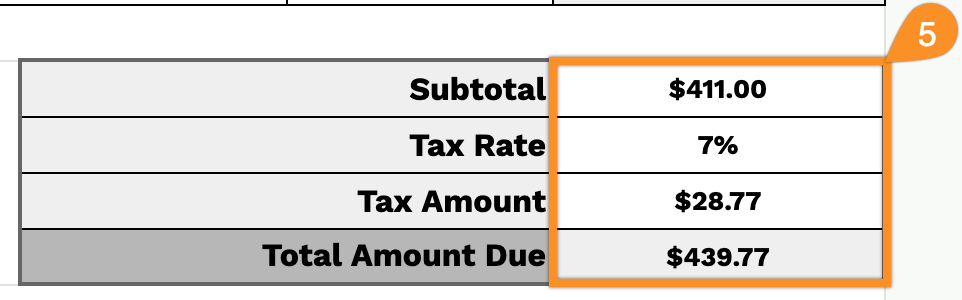 5. Add the applicable tax rate, and the template will handle the subtotal, tax amount, total due, and any remaining balance.