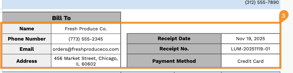 3. Complete the “Bill To” section with the customer’s information, along with the receipt date, receipt number, and payment method.