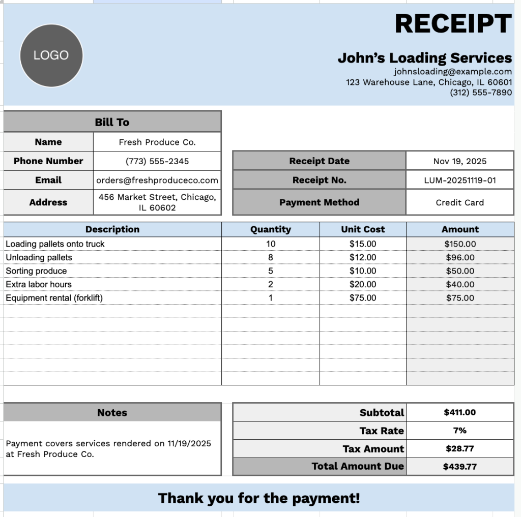 Our Lumper Receipt Template provides a professional format for documenting loading and unloading services at warehouses and distribution centers.