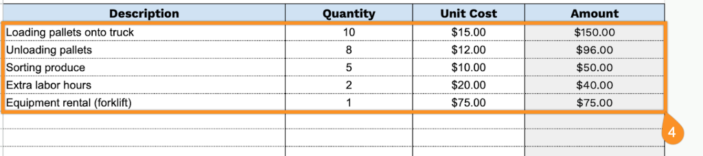 - Multi-line itemized service table: Features pre-formatted rows with four essential columns, including Description (for detailing unloading/loading services), Quantity (units or hours worked), Unit Cost (rate per unit), and Amount (auto-calculating line total), enabling detailed breakdowns of all lumper services performed.