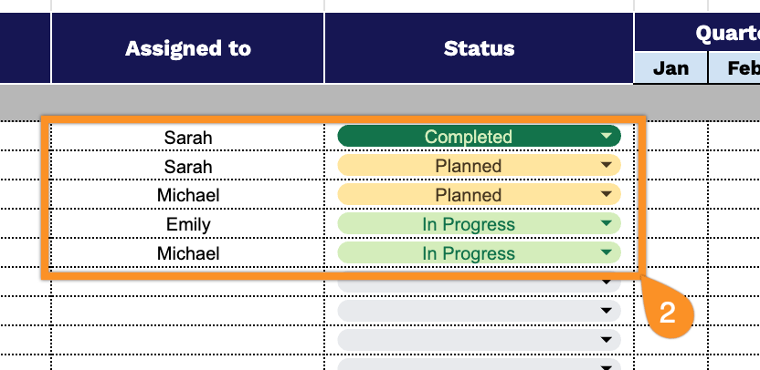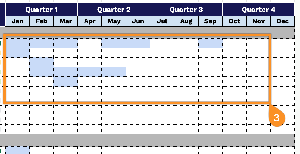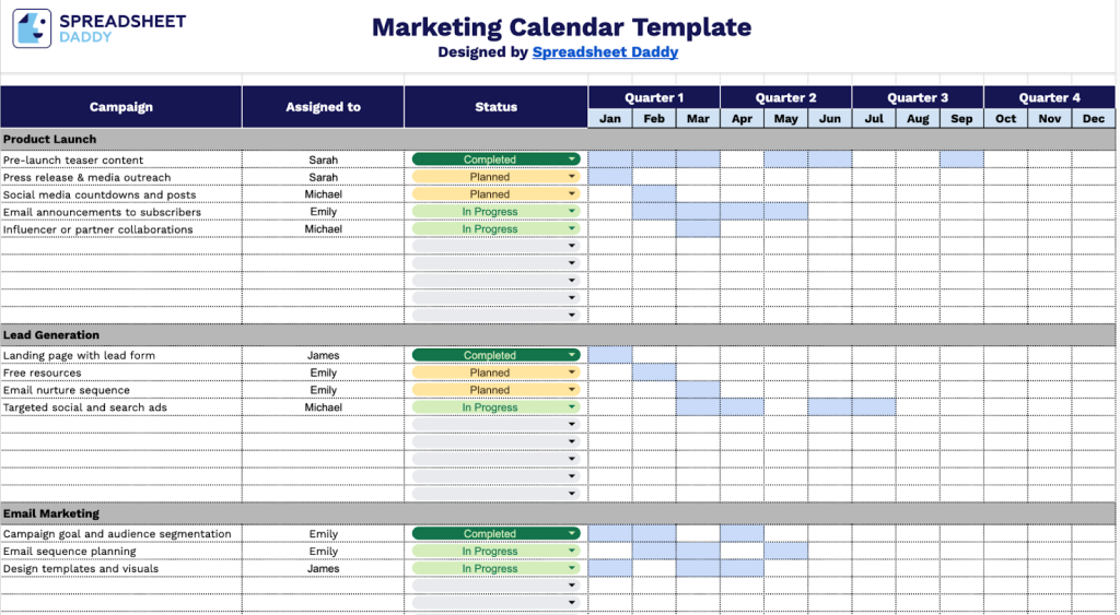 - Annual planning structure: A 12-month timeline spanning Quarter 1 through Quarter 4 (January to December) with individual monthly columns, enabling you to visualize your entire marketing year at a glance. This quarterly breakdown helps align campaigns with business cycles and seasonal opportunities.
