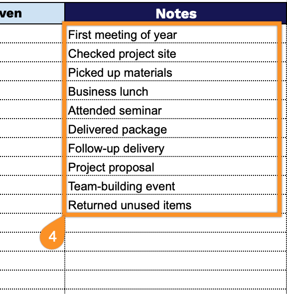 3. Complete the columns by entering all essential mileage tracking information: