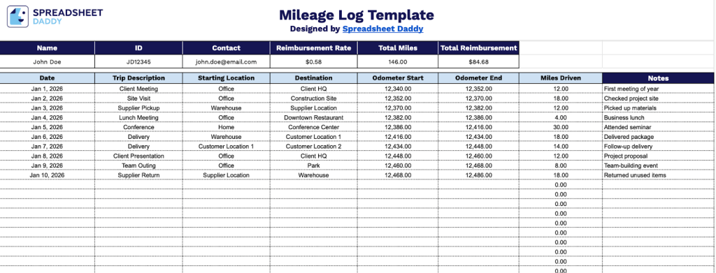 - Comprehensive trip-tracking columns: Each row captures essential trip data, including Date, Trip Description, Starting Location, Destination, Odometer Start, Odometer End, and Miles Driven, providing complete documentation of every business journey for tax purposes, employer reimbursement, or personal record-keeping.