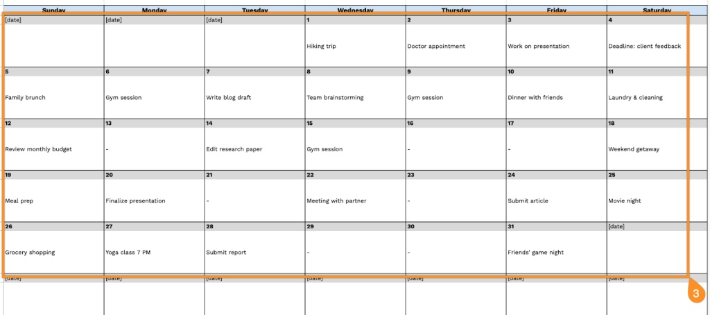 - Customizable month and year headers: Editable fields at the top of the template let you personalize the calendar for any time period. This makes it easy to reuse the same template across multiple months and years without creating new documents each time.