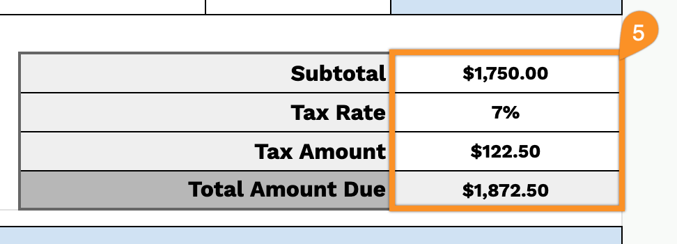 5. Apply the relevant tax rate. The template will automatically calculate the subtotal, tax amount, amd total amount due.