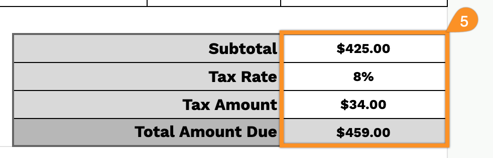 • Automated financial calculation system: Built-in formula fields automatically compute the subtotal from all line items, apply a configurable tax rate percentage, calculate the tax amount, and display the total amount due, ensuring accuracy and eliminating manual calculation errors.