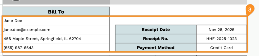 3. Provide the “Bill To” information, along with the receipt date, receipt number, and payment method used.