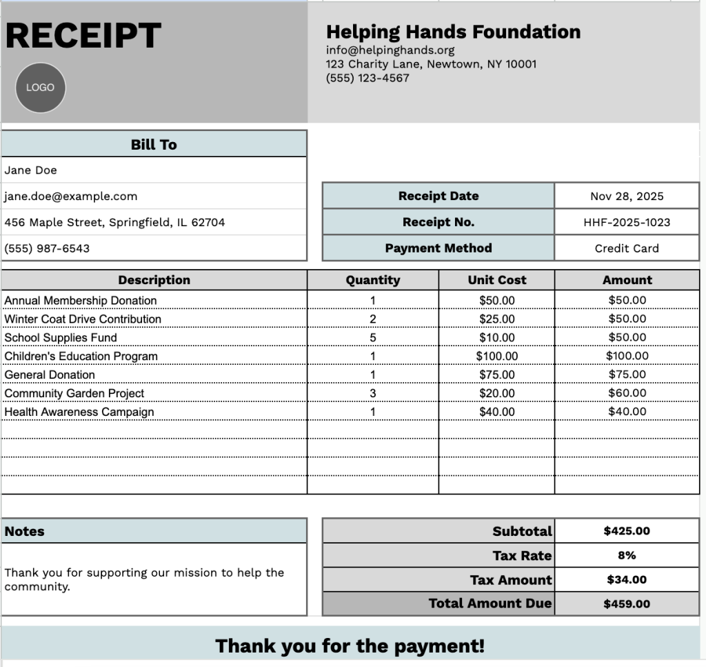 • Comprehensive donor and receipt-tracking fields: The “Bill To” section captures complete donor information, including name, email, address, and phone number, and provides fields for receipt date, unique receipt number, and payment method to ensure proper record-keeping and tax compliance.