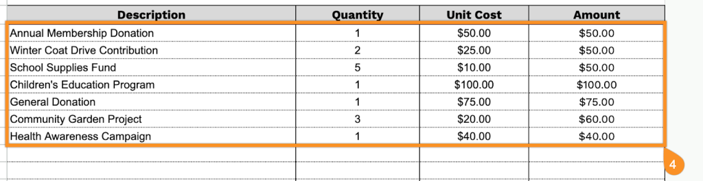 • Flexible itemized transaction table: A multi-row table with four columns (Description, Quantity, Unit Cost, Amount) accommodates up to 11 line items, enabling you to provide detailed breakdowns of donations, membership fees, event tickets, or purchased goods with individual amount calculations for each entry.