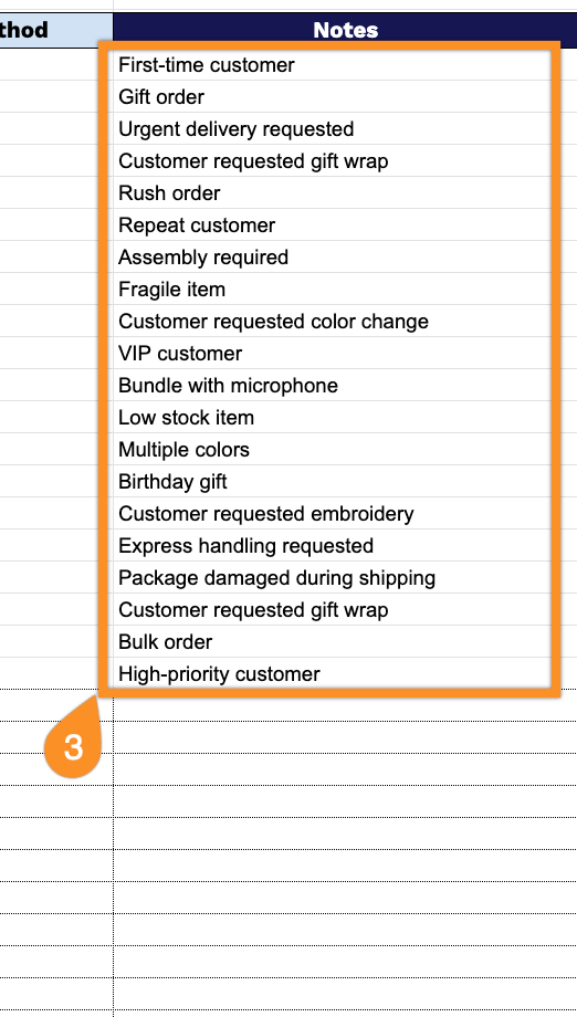• Flexible notes documentation: The Additional Notes column provides space for custom information, special instructions, customer requests, or order-specific details that don’t fit standard fields. This ensures essential contextual information stays attached to each order record.