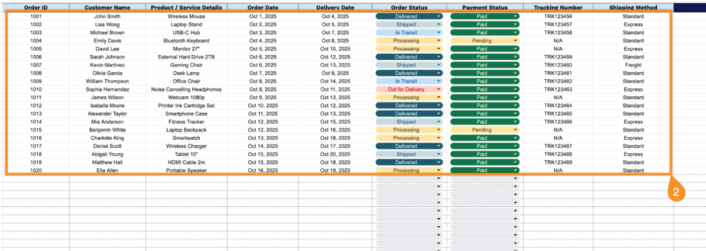 • Integrated shipping logistics: Monitor deliveries with dedicated Tracking Number and Shipping Method columns that accommodate multiple carriers and shipping options. This centralized approach eliminates the need to check various carrier websites for order updates.