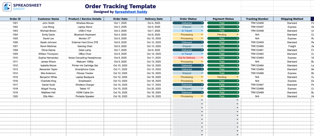 An order tracking spreadsheet is a digital document used to monitor and manage customer orders from placement through delivery.