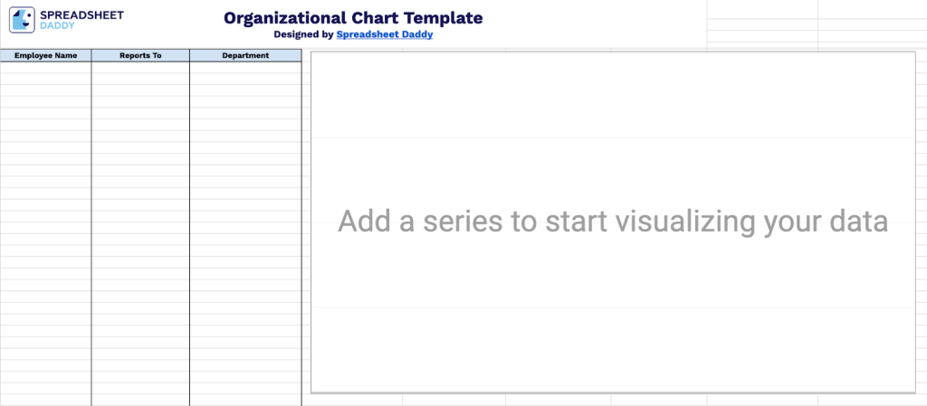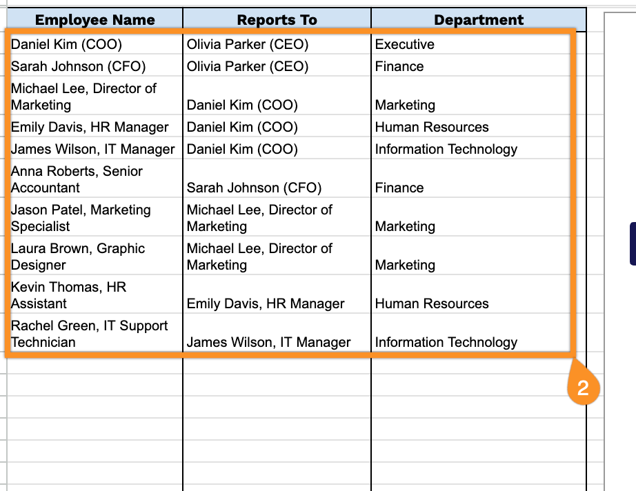 - Three-column data structure: Simple input table with Employee Name, Reports To, and Department columns that serve as the foundation for generating your organizational hierarchy.