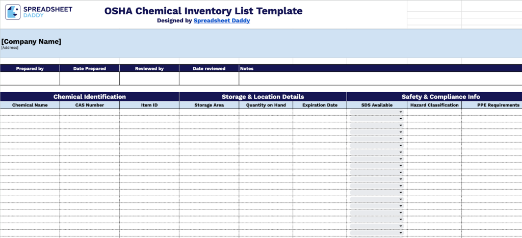 Our OSHA Chemical Inventory List Template helps you track and manage all chemicals in your workplace, ensuring compliance with OSHA regulations and keeping your team safe.
