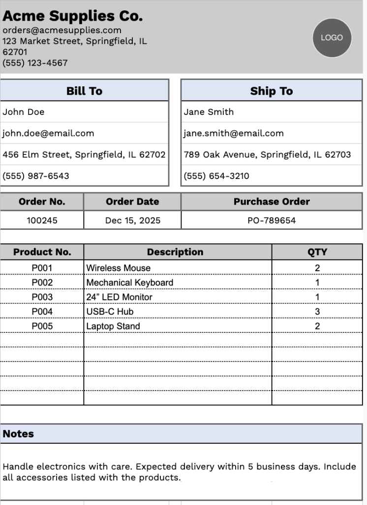 Available in Google Sheets, Google Docs, Excel, Word, and PDF, it’s easy to edit and ensures accurate tracking of items, quantities, and shipping details.