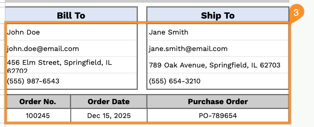 - Dual contact information sections: The template features separate “Bill To” and “Ship To” sections, each with complete contact fields including name, email, address, and phone number, enabling you to clearly distinguish between the billing party and shipping destination for accurate order fulfillment.