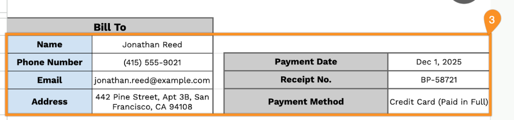 3. Fill in the customer’s information under “Bill To,” along with the payment date, receipt number, and payment method.