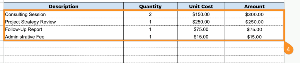 4. List the items or services provided. Include the quantity and unit price for each, and the template will automatically calculate the line totals.