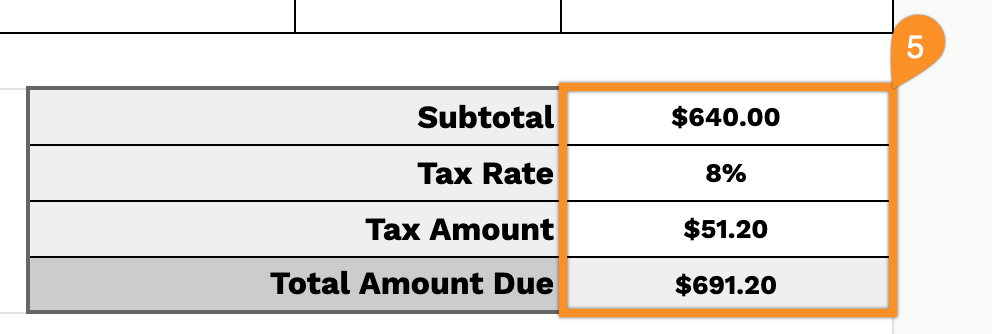 5. Apply the appropriate tax rate. The template will automatically calculate the subtotal, tax amount, and total amount paid.
