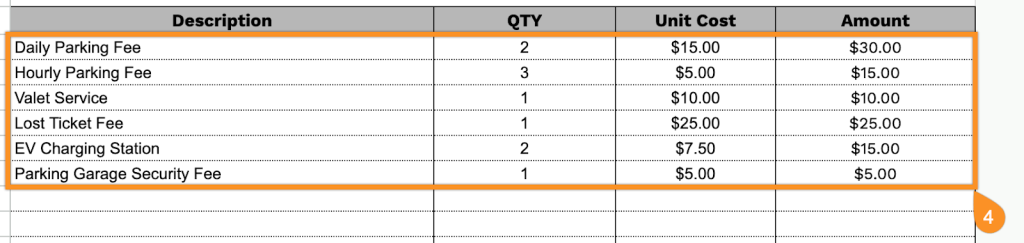 4. List the parking services provided. Include the quantity (e.g., hours or days) and the rate for each service, and the template will automatically calculate the line totals.