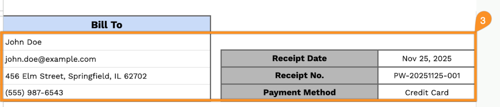 3. Fill in the “Bill To” section with the customer’s information, along with the receipt date, receipt number, and payment method.