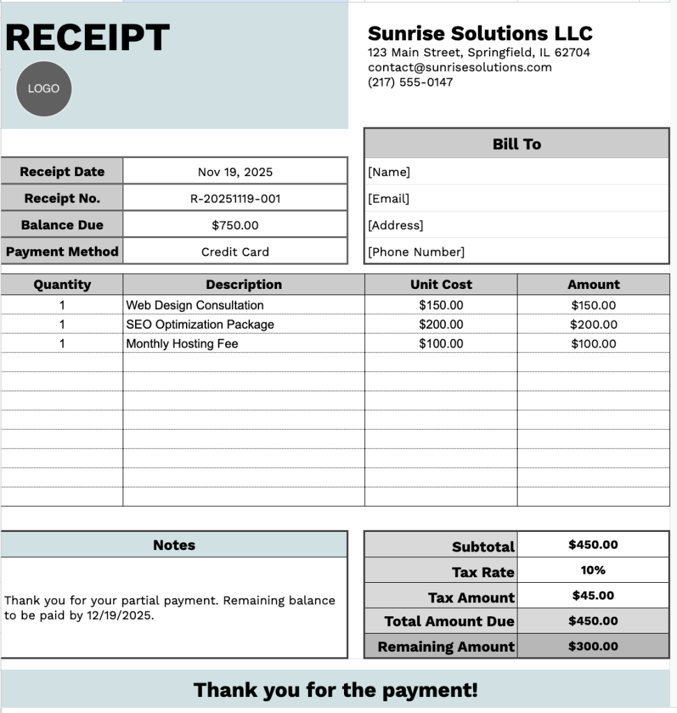 - Detailed transaction-tracking fields: Receipt-specific information, including receipt date, receipt number, balance due, and payment method, provides complete traceability and reference for partial payment transactions, making it easy to track payment history and outstanding balances.