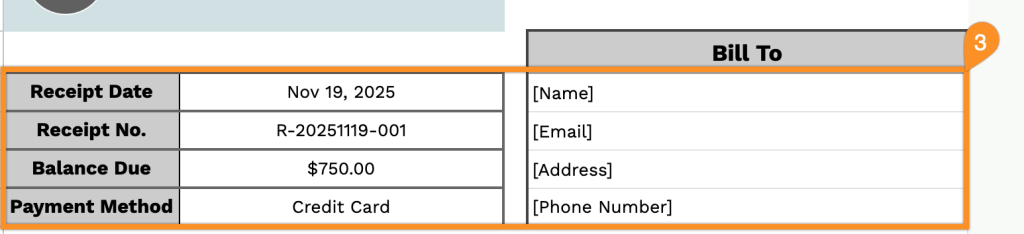 3. Fill in the customer’s information along with the receipt date, receipt number, balance due, and payment method.