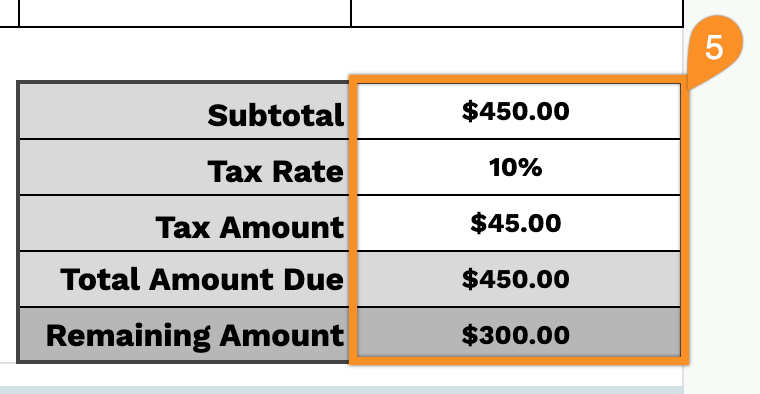 5. Enter the applicable tax rate, and the template will calculate the subtotal, tax amount, total due, and remaining balance.