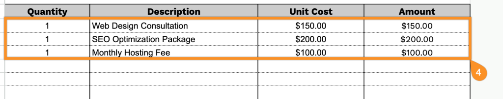 4. List the items provided, including quantity and price for each. The template will automatically calculate the line totals.