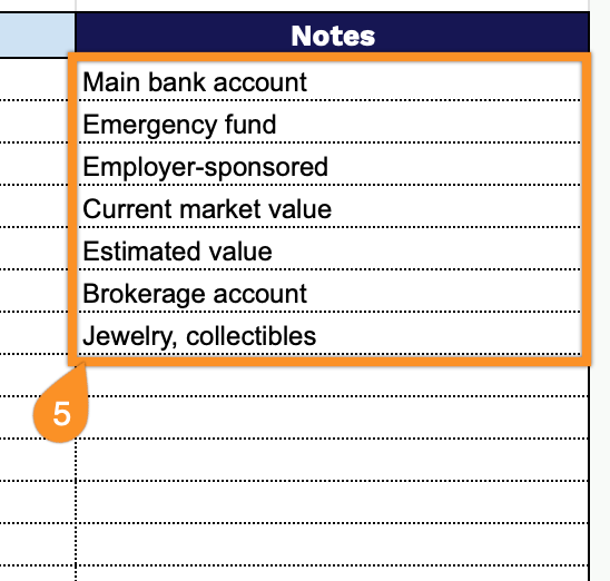 - Comprehensive asset tracking section: The Assets portion features multiple rows with three columns (Description, Amount, Notes) that allow you to itemize and categorize all your holdings, including cash, investments, real estate, vehicles, and personal property, with an automatic total calculation at the bottom to sum your complete asset portfolio.