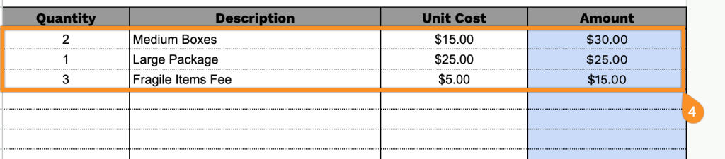 - Multi-row itemization table: A table with four structured columns (Quantity, Description, Unit Cost, Amount) with pre-formatted rows enables you to list items, services, products, or additional charges with a precise pricing breakdown for transparency and clarity.