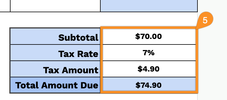 5. Add the applicable tax rate. The template will automatically calculate the subtotal, tax amount, and total amount due.