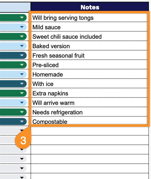 • Flexible notes section: The Notes column offers space for additional details such as serving instructions, ingredient lists, heating requirements, or special requests, giving you complete context for each dish and streamlining day-of-event logistics.