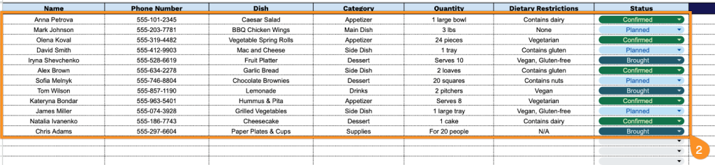 • Dietary restriction documentation: A dedicated column for dietary restrictions lets you track allergies, vegetarian, vegan, gluten-free, and other special requirements, ensuring all guests can safely enjoy the potluck and that hosts can plan accordingly.