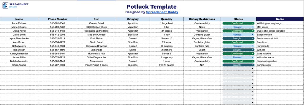 • Comprehensive guest tracking columns: The template features seven organized columns to capture all essential potluck information, including Name, Phone Number, Dish, Category, Quantity, Dietary Restrictions, Status, and Notes, ensuring you have complete visibility into attendee contributions and can coordinate a well-balanced meal selection.