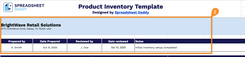 2. Record your company name, location, stock keeper’s details, and the date finished. Add the manager’s name and review date. The Notes field is for any extra observations.