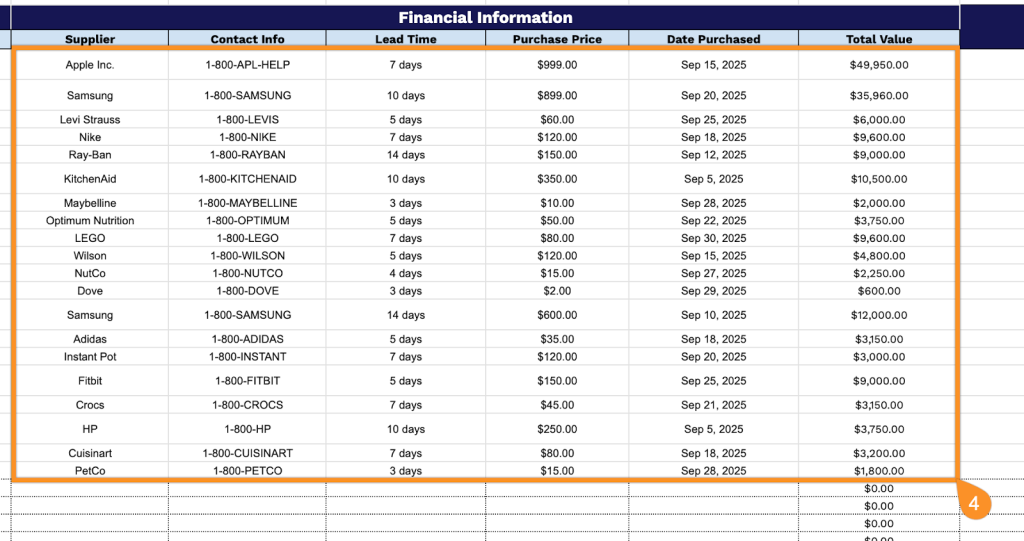 - Financial visibility and control: Monitor purchasing costs with the Purchase Price, Date Purchased, and Total Value columns, which automatically calculate inventory worth based on quantity and unit pricing for accurate budget tracking.