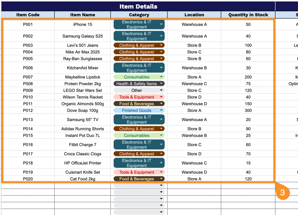 - Comprehensive item identification system: Track products with dedicated fields for Item Code, Item Name, Category, and Location to ensure clear organization and easy retrieval of inventory across multiple storage areas.