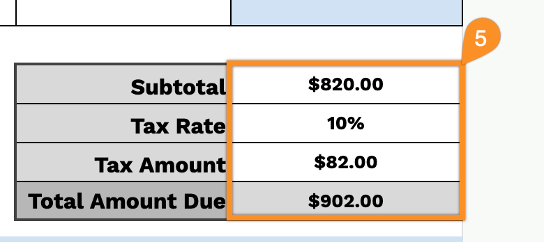 5. Apply the relevant tax rate. The template will automatically calculate the subtotal, tax amount, and total amount due.