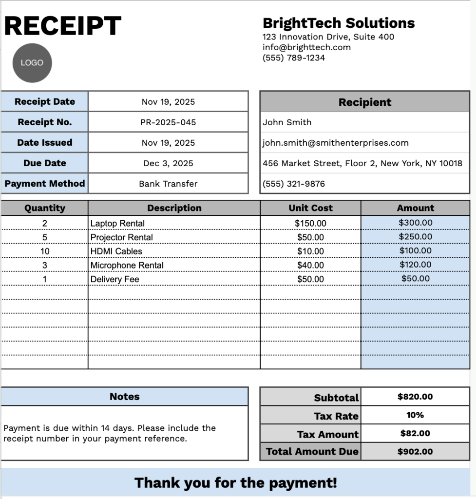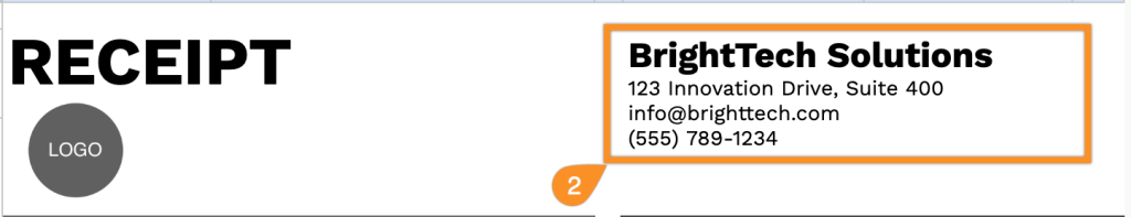 - Clearly structured company and recipient information: Organized fields let you enter the company name, address, email, phone number, receipt date, receipt number, and due date, so all essential details are presented in a clean, consistent format.