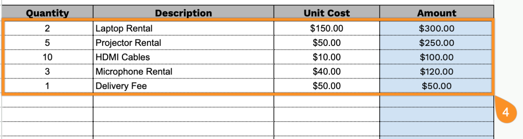 - Multi-row itemization table for accurate pricing: A structured table with Quantity, Description, Unit Cost, and Amount columns helps you list all products or services with a clear cost breakdown for complete transparency.