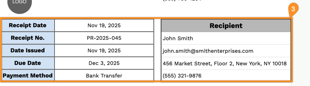 3. Fill in the recipient’s information along with the receipt number, issue date, due date, and payment method.